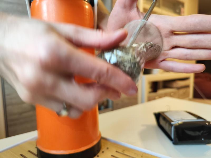 - Слегка встряхните сосуд, тем самым присыпав бомбижью йербой так, чтобы фильтр был погружен полностью под йербой, сохранив при этом горочку.