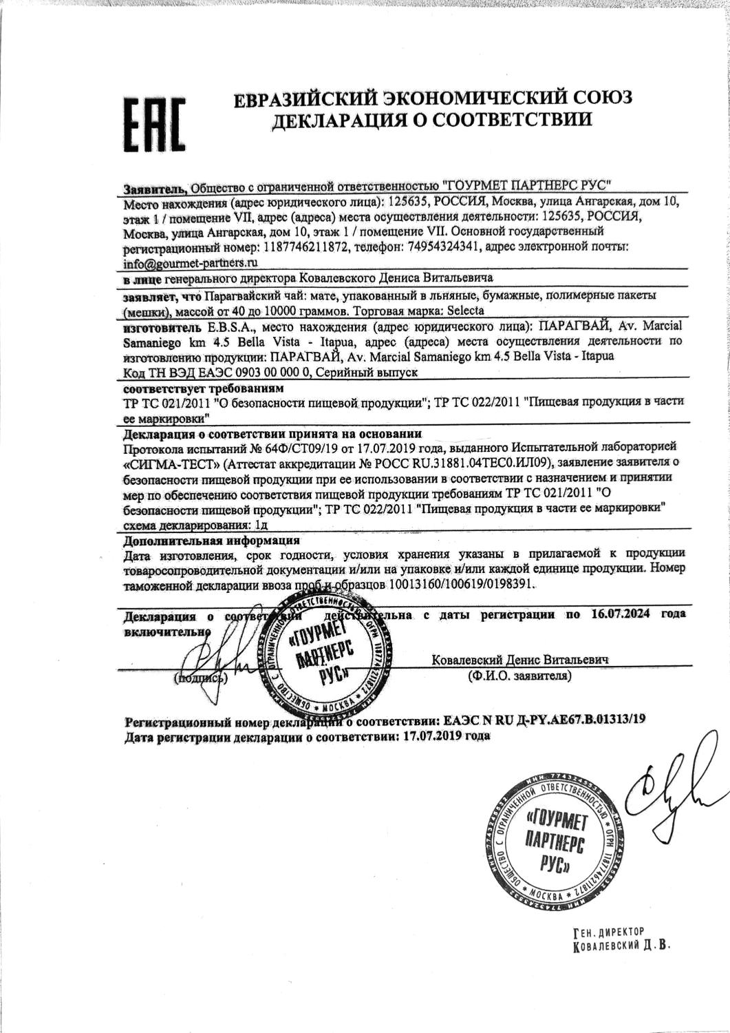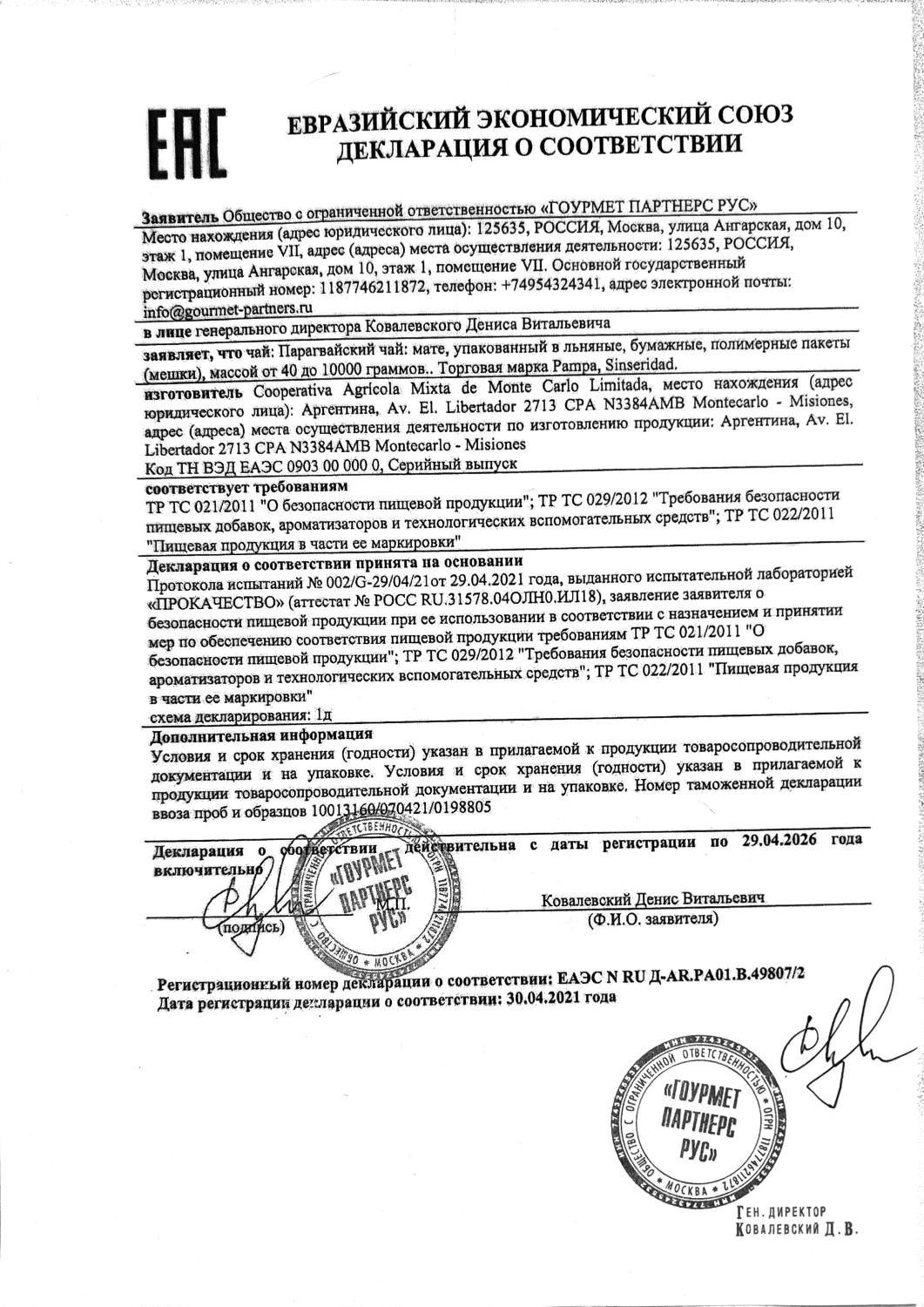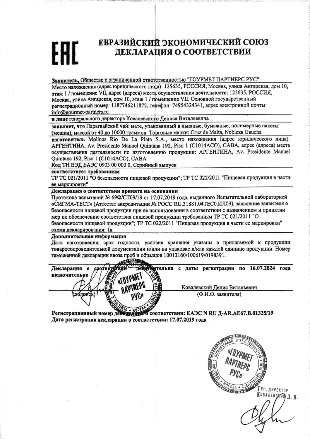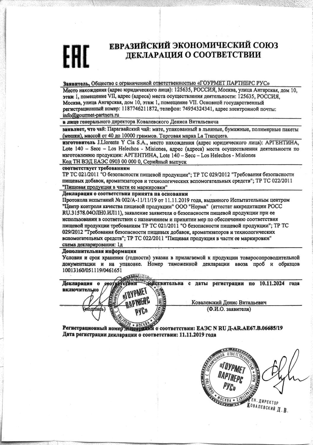 Декларация соответствия (Taragui, Union, La Merced)