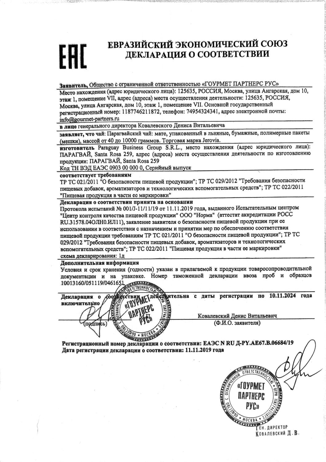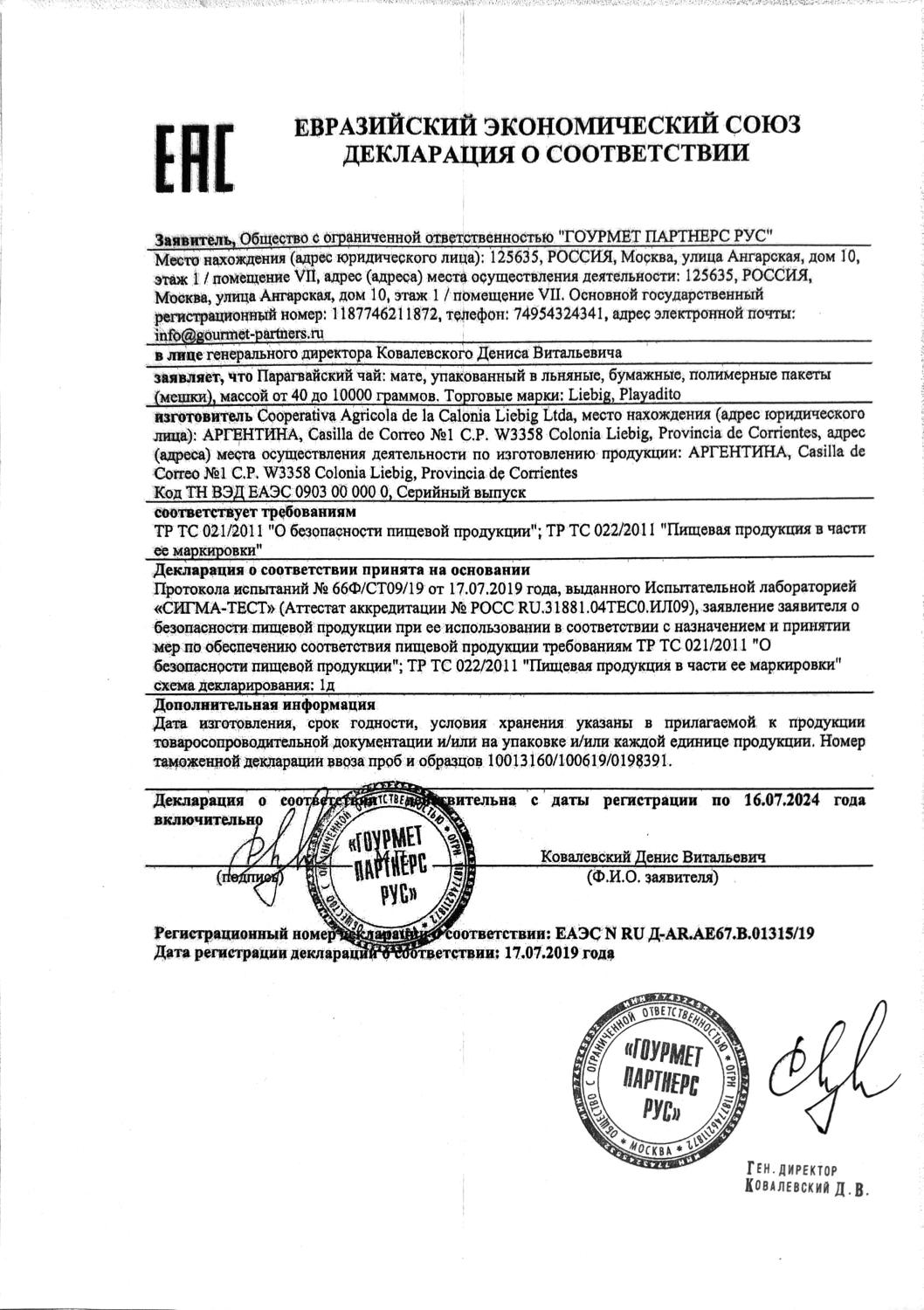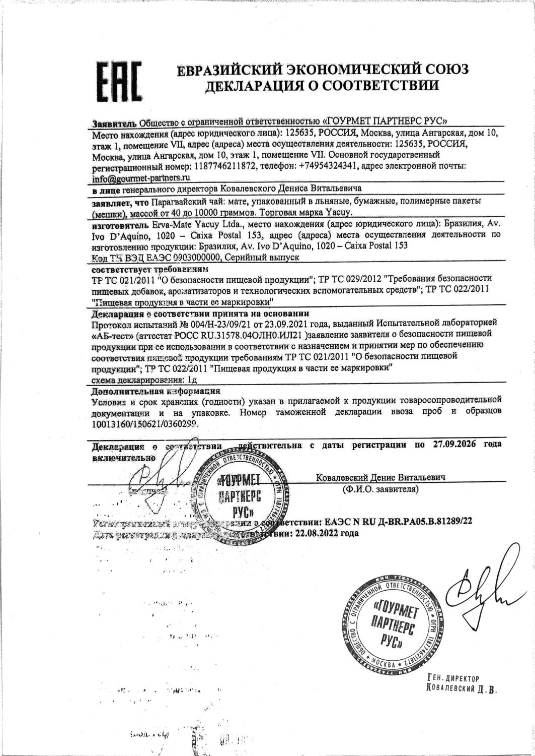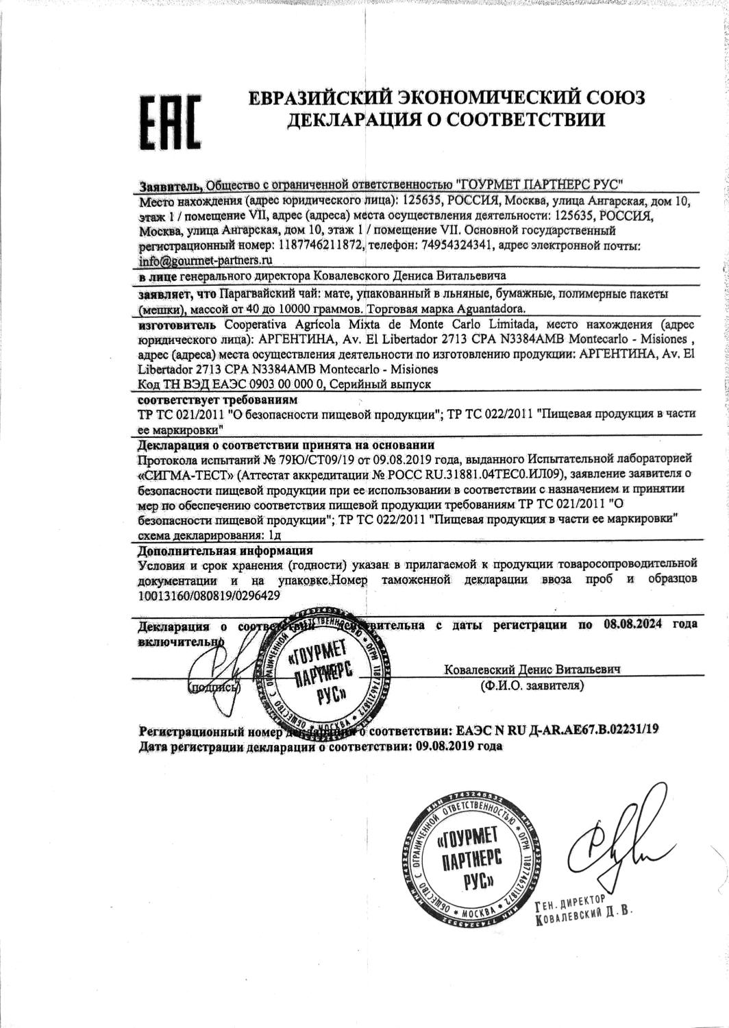 Декларация соответствия (Taragui, Union, La Merced)