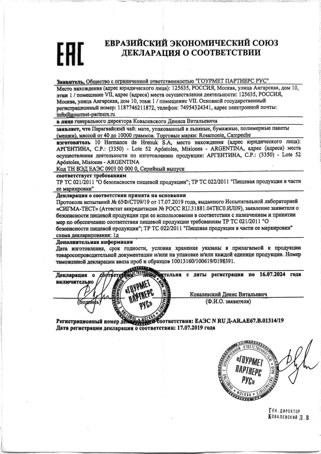 Декларация соответствия (Rosamonte)
